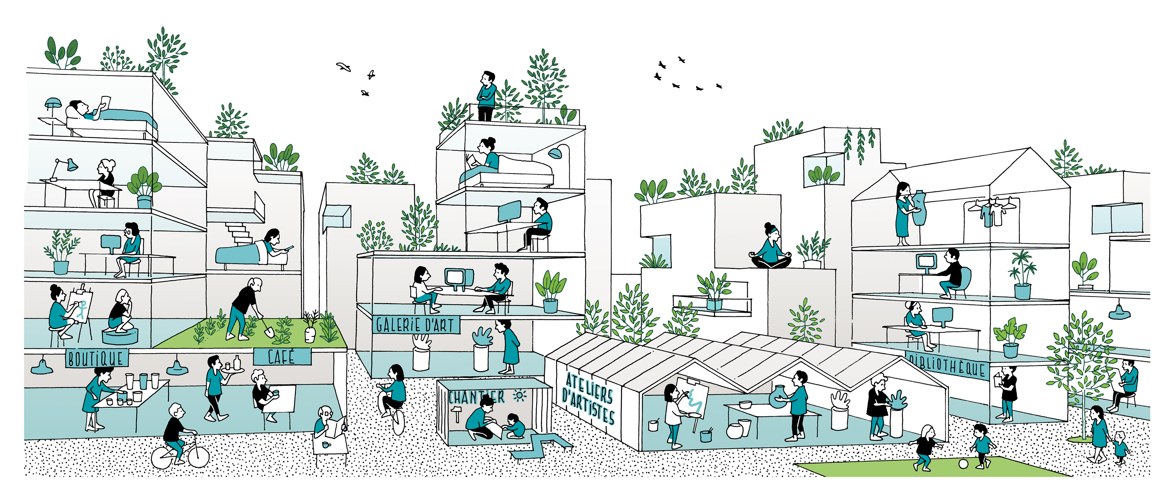 Réalisation d'une illustration pour une conférence sur l'urbanisme transitoire en Europe organisée par SNCF Immobilier et Plateau Urbain au MIPIM 2019.